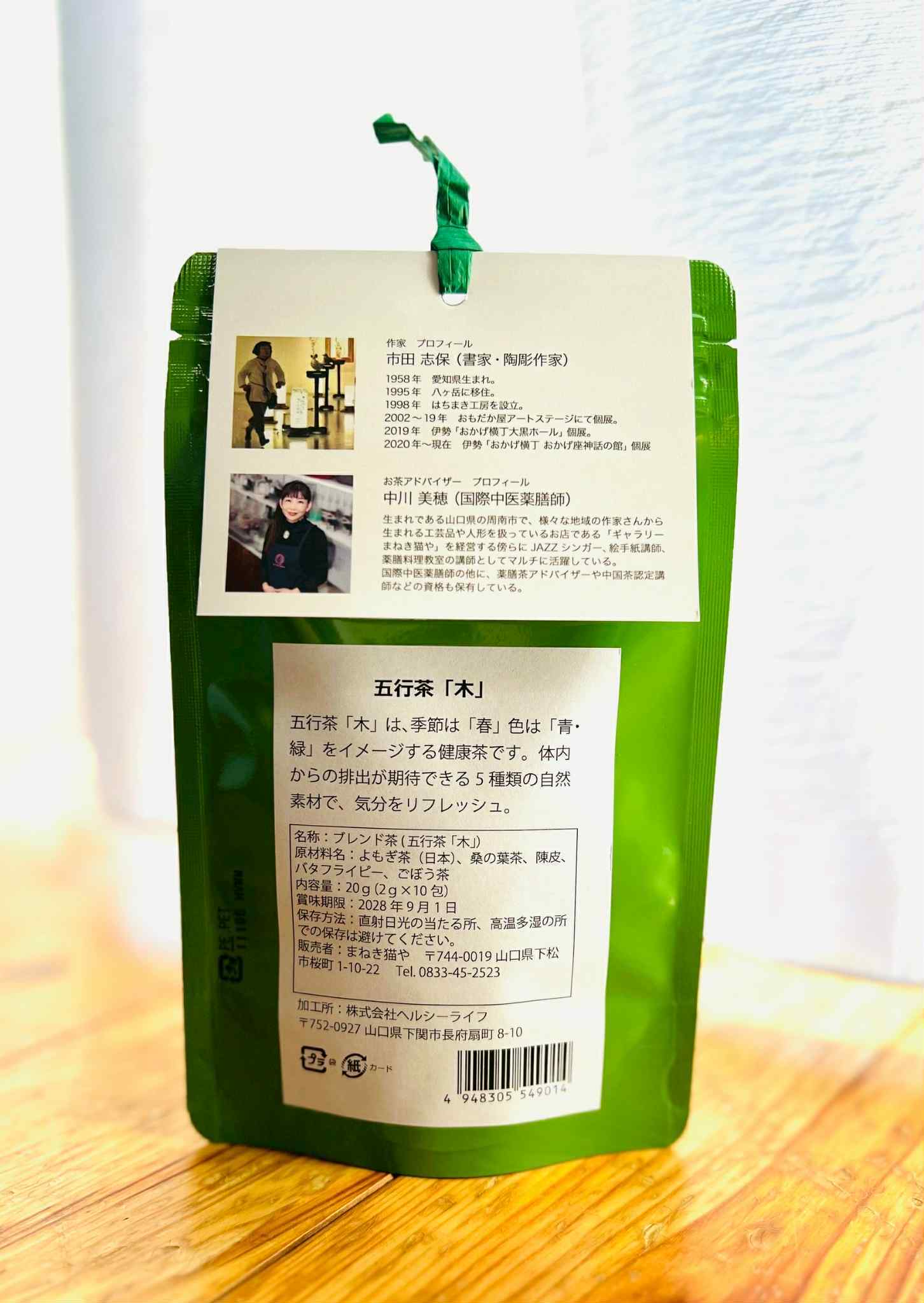 五行茶「木」は、季節は「春」色は「青・緑」をイメージする健康茶です。体内からの排出が期待できる5種類の自然素材で、気分をリフレッシュ。